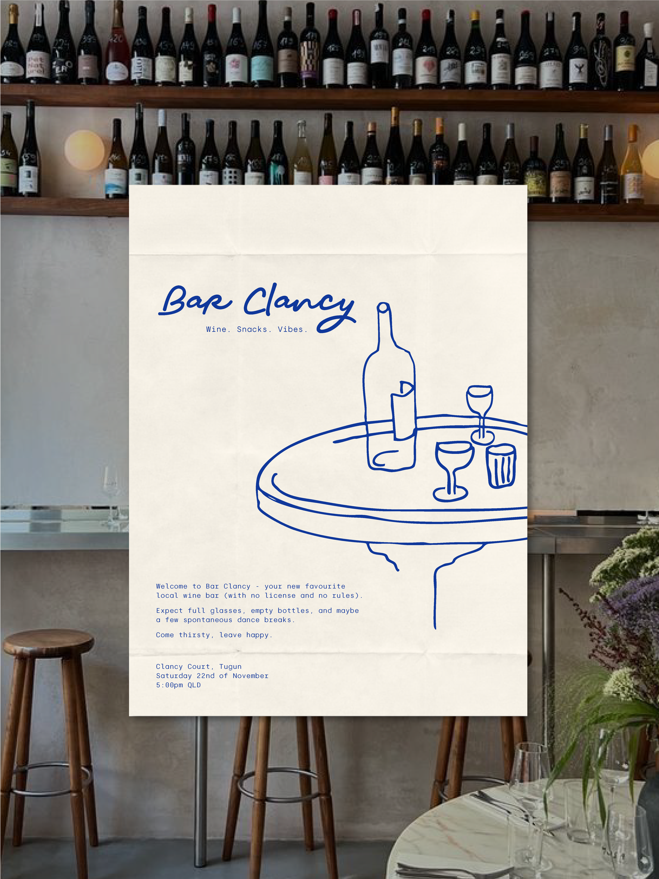 The brief: Welcome to Bar Clancy. A local wine bar serving good vibes and good wine. Illustrations throughout the branding to enhances the quirky vibe of the bar, with a hand written font and typewriter text forming the basis of the brand.